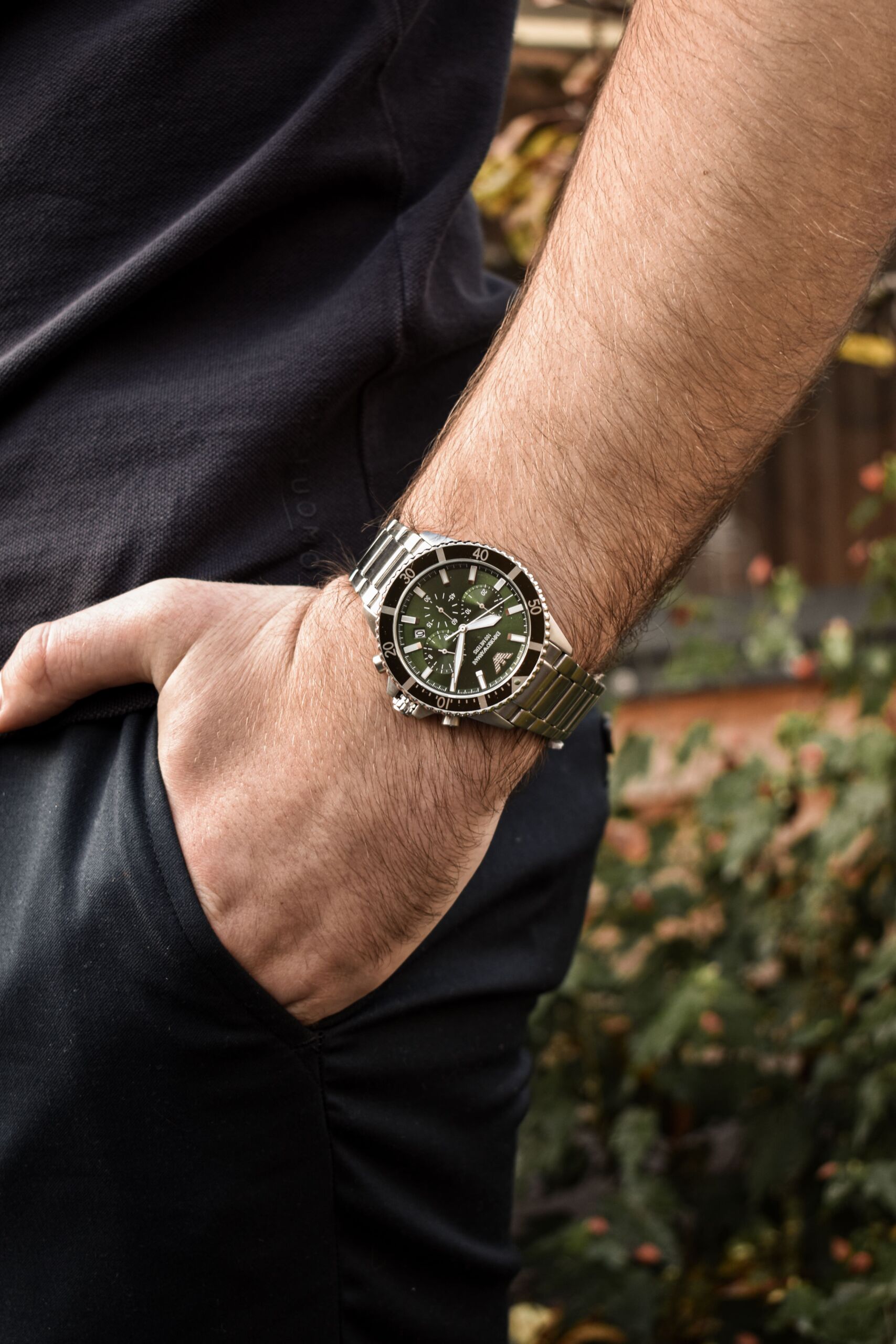 De wijzerplaat in een diep groene tint biedt een unieke en stijlvolle achtergrond voor de tijdweergave. Het mineraalglas beschermt de wijzerplaat tegen krassen en stoten, zodat uw horloge er altijd als nieuw uitziet.